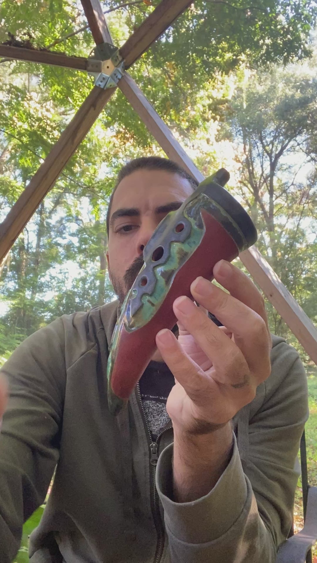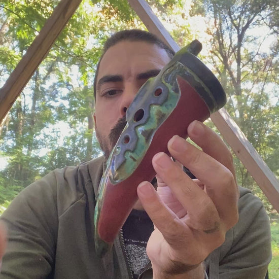 Add a unique and beautiful sound to your musical repertoire with the Harmonic Minor Gemshorn. This ceramic gemshorn style ocarina is tuned to the harmonic minor scale in the key of G (432Hz) for a unique and haunting sound. Featuring a stunning labradorite inlay and intricate carving, this instrument is sure to stand out and impress.