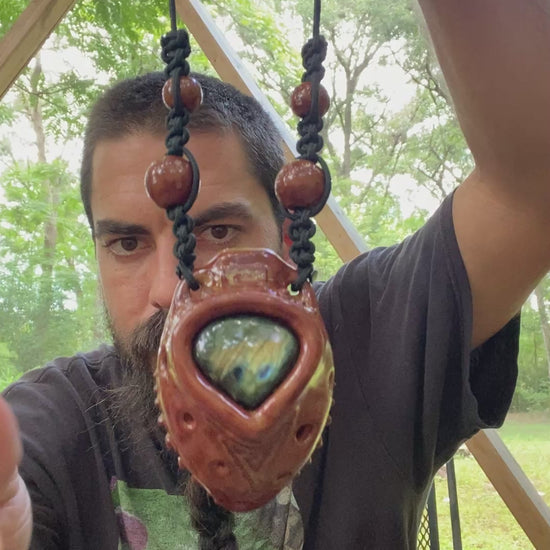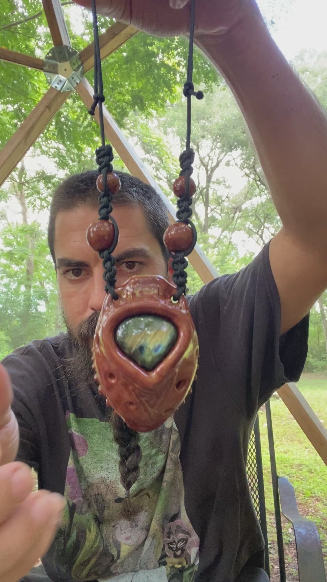This hand-sculpted ocarina is crafted from red earthenware clay, serving as a one-of-a-kind musical instrument. Tuned to the Harmonic Minor scale in the key of D, this ocarina produces intricate melodic sounds. Its unique design is further enhanced by a labradorite stone inlay.