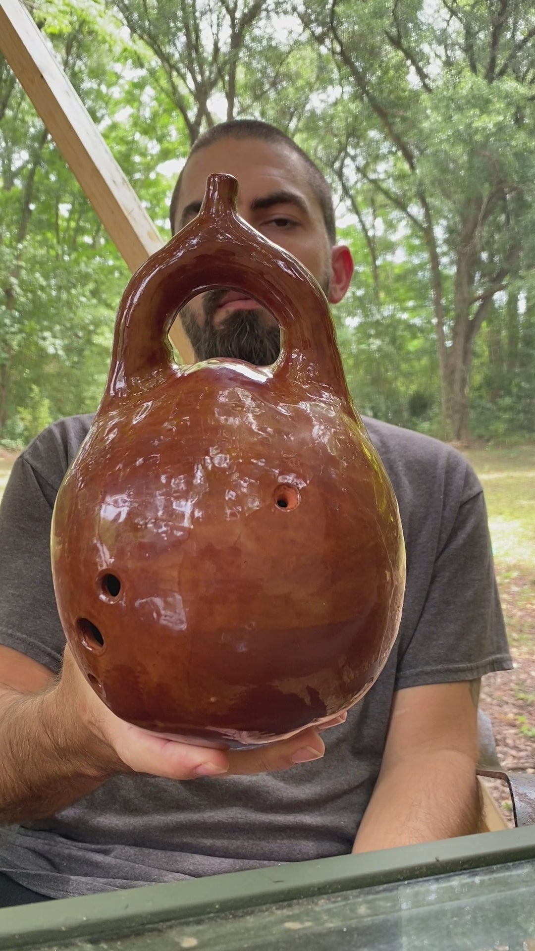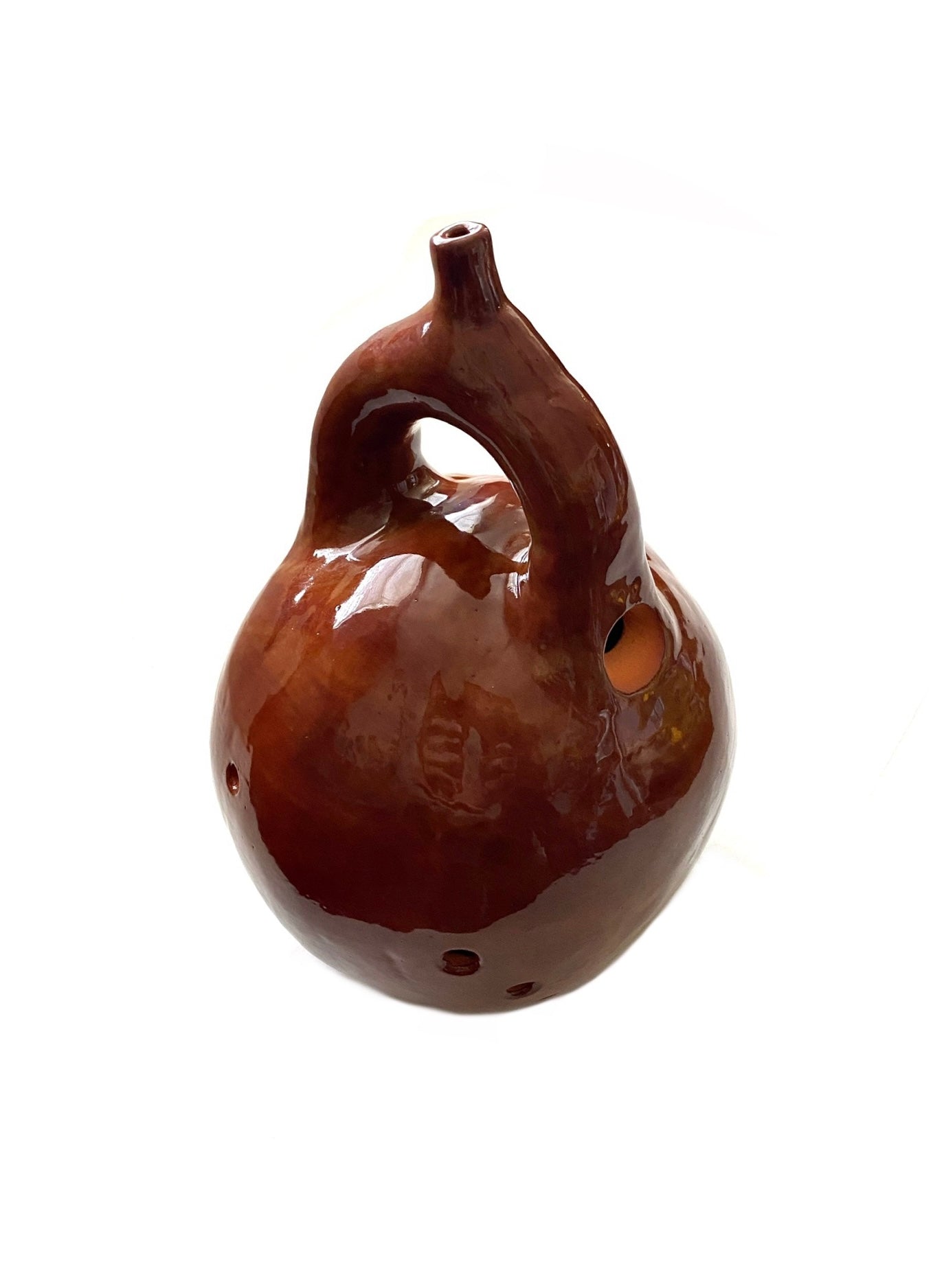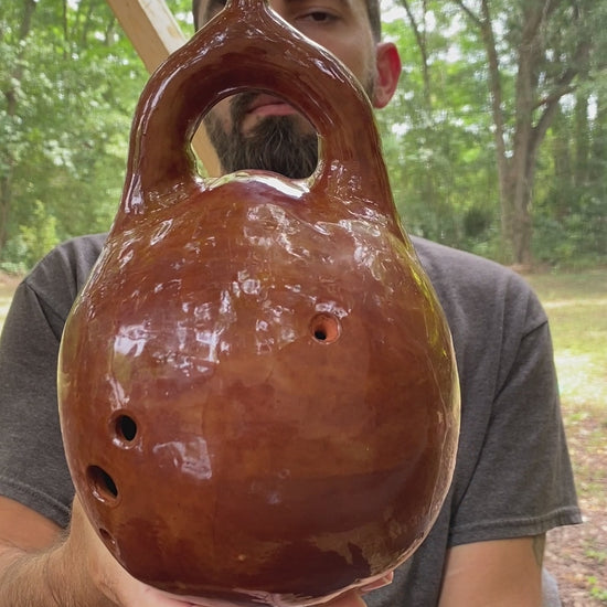The Kettlebell Drone is a beautifully crafted, handmade vessel flute with two chambers made of clay. Its deep, harmonious tones are tuned to the Harmonic Minor Scale in the key of F# (432Hz).