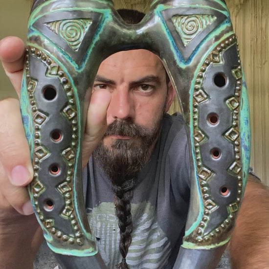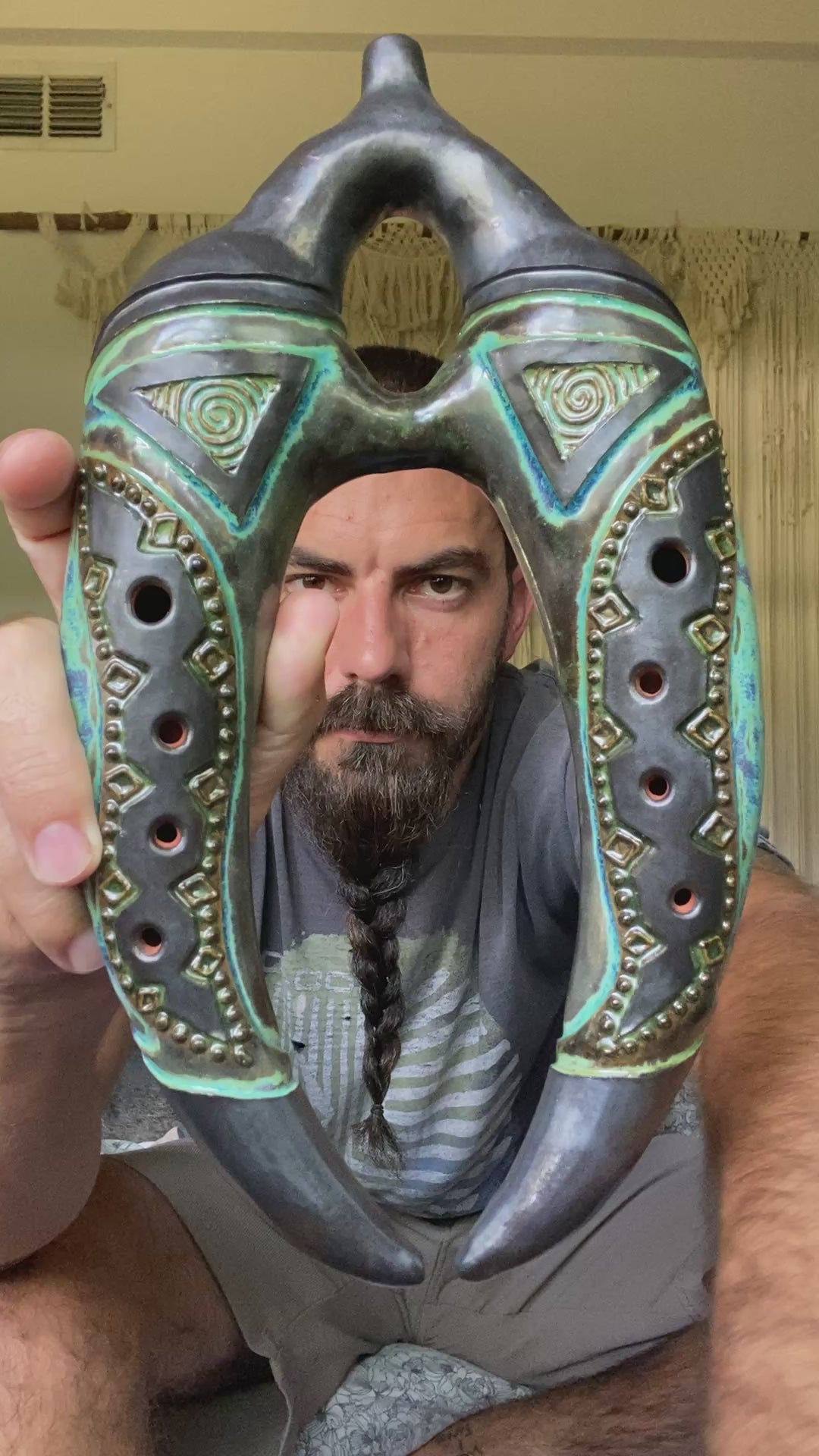 Expertly handcrafted, the Mandible Mirror Drone is a double chamber flute made of red earthenware clay with intricate carvings. Tuned to pentatonic minor in the key of Db, it offers a unique and precise sound. Elevate your musical experience with this beautifully designed instrument.