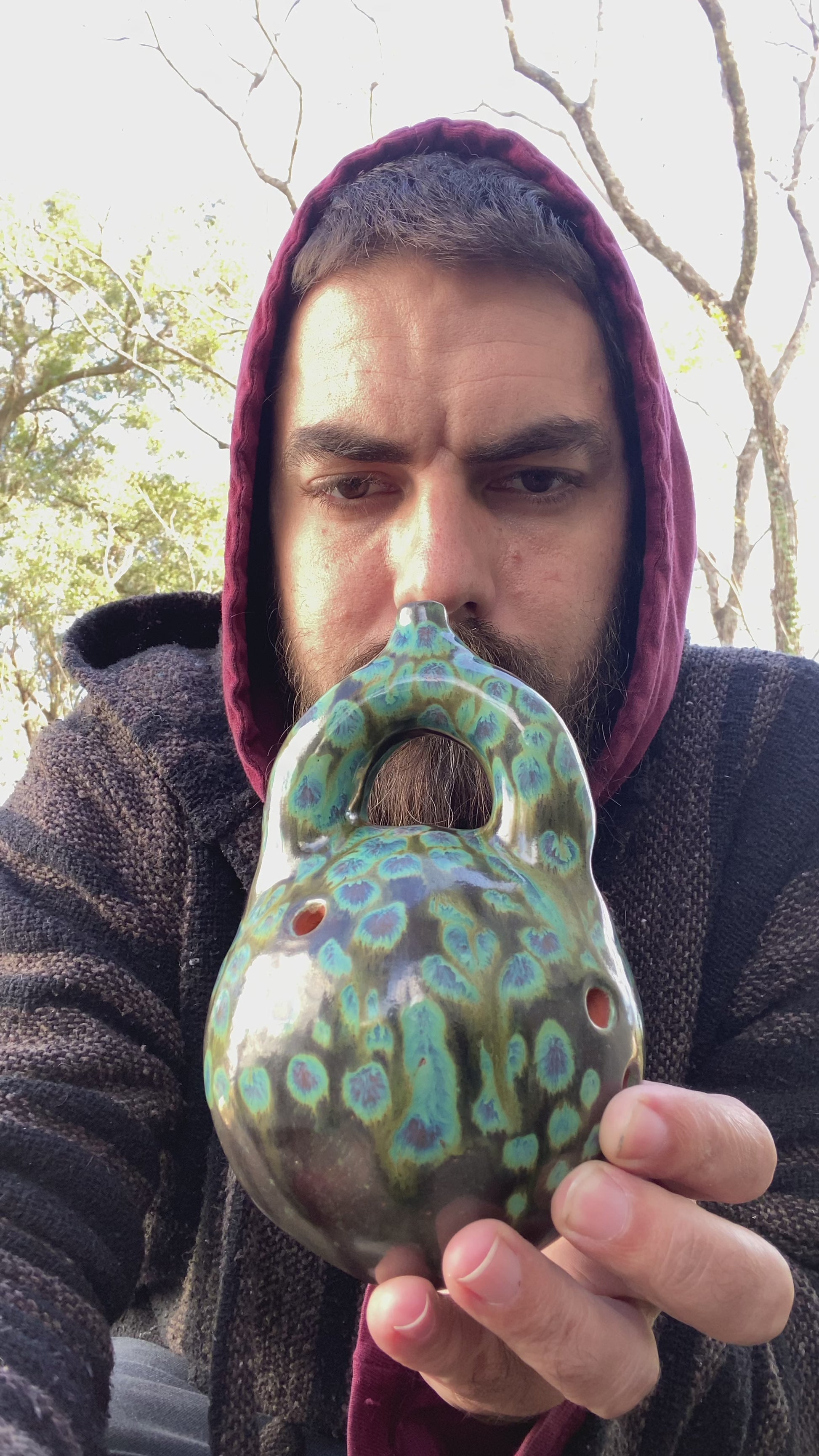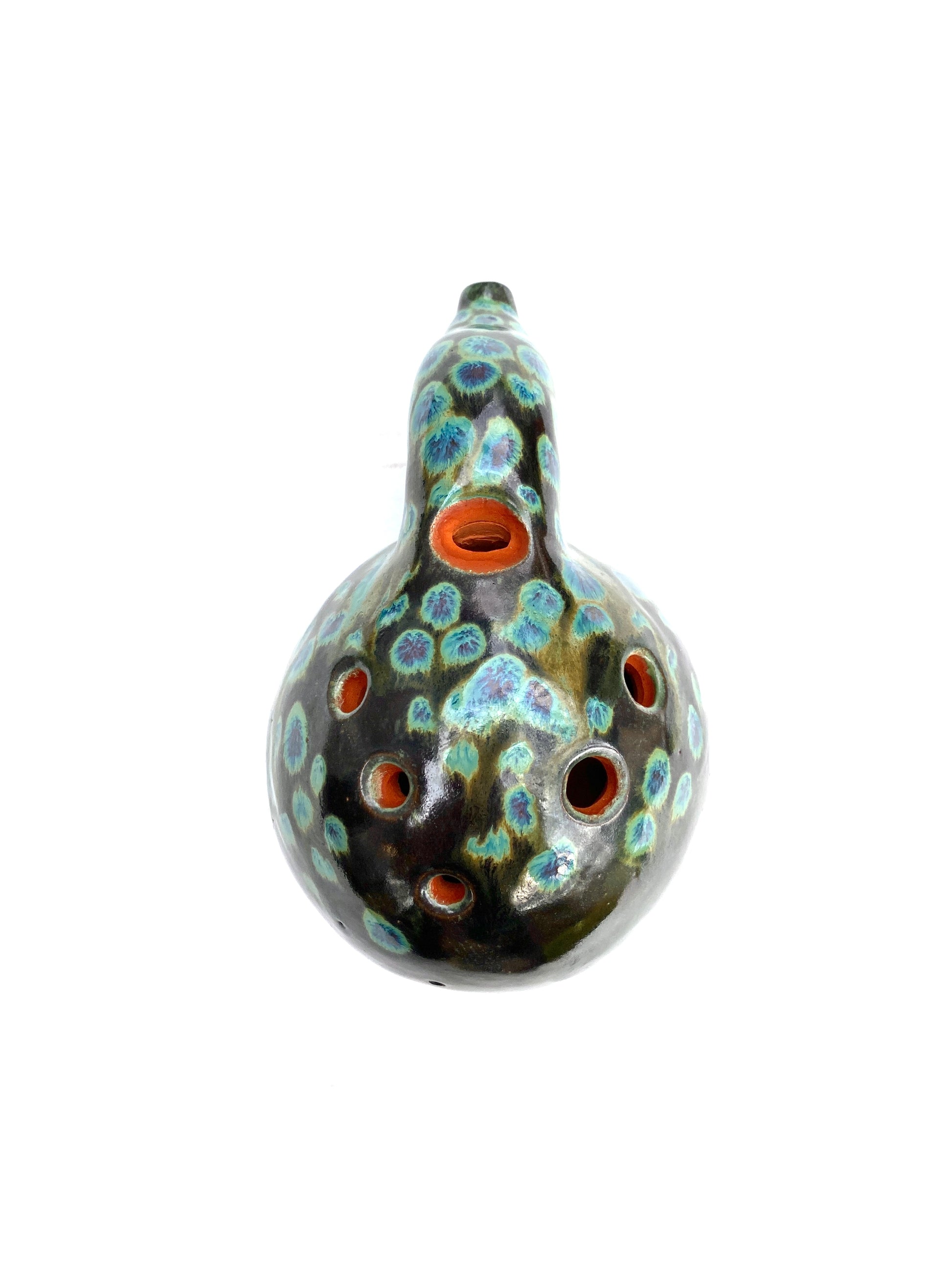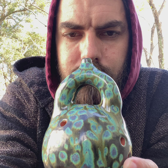 Experience the harmonious fusion of art and music with the Orb Drone Vessel. This rare handmade clay sphere doubles as a two chamber flute, precisely tuned to the pentatonic minor scale in the key of F# (440Hz). Perfect for creating captivating melodies, this vessel is truly one-of-a-kind.