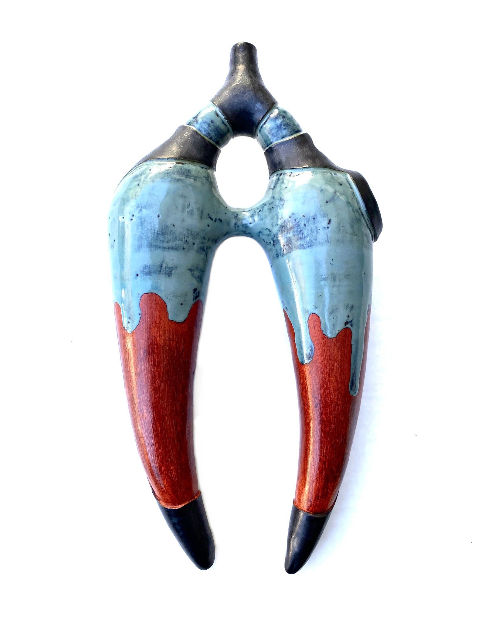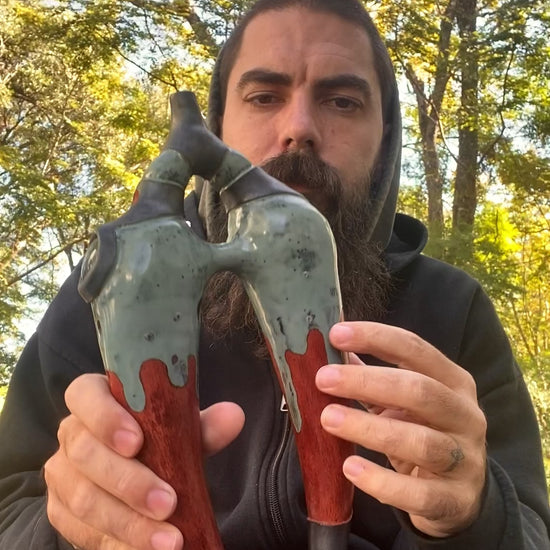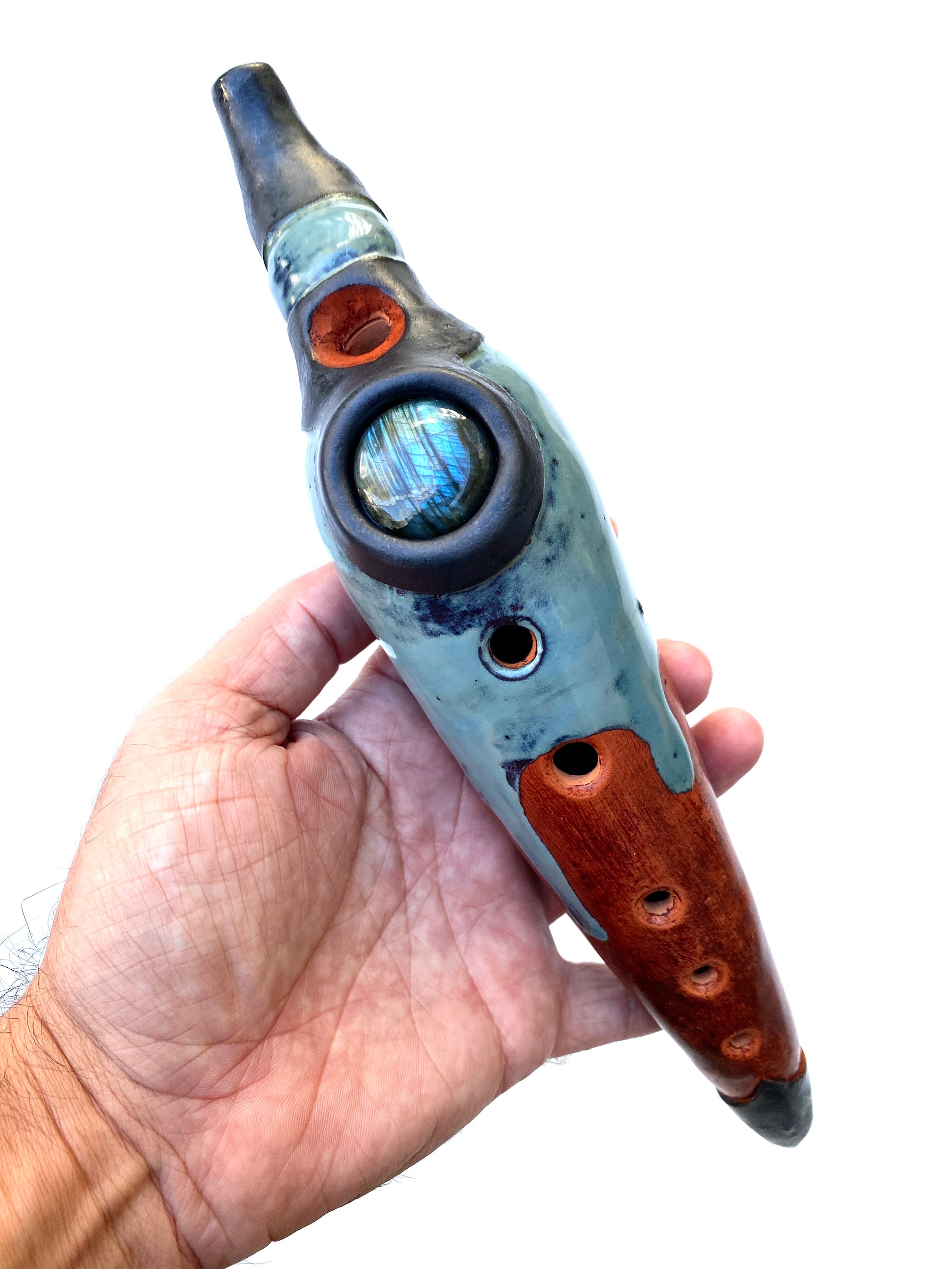This Pentatonic Drone Vessel offers a unique shape and is handmade with red earthenware clay, featuring a beautiful labradorite inlay. With a comfortable design and tuned to Eb (432Hz), this vessel provides a dynamic and harmonious playing experience. Perfect for a professional musician or collector seeking a distinctive and high-quality instrument.