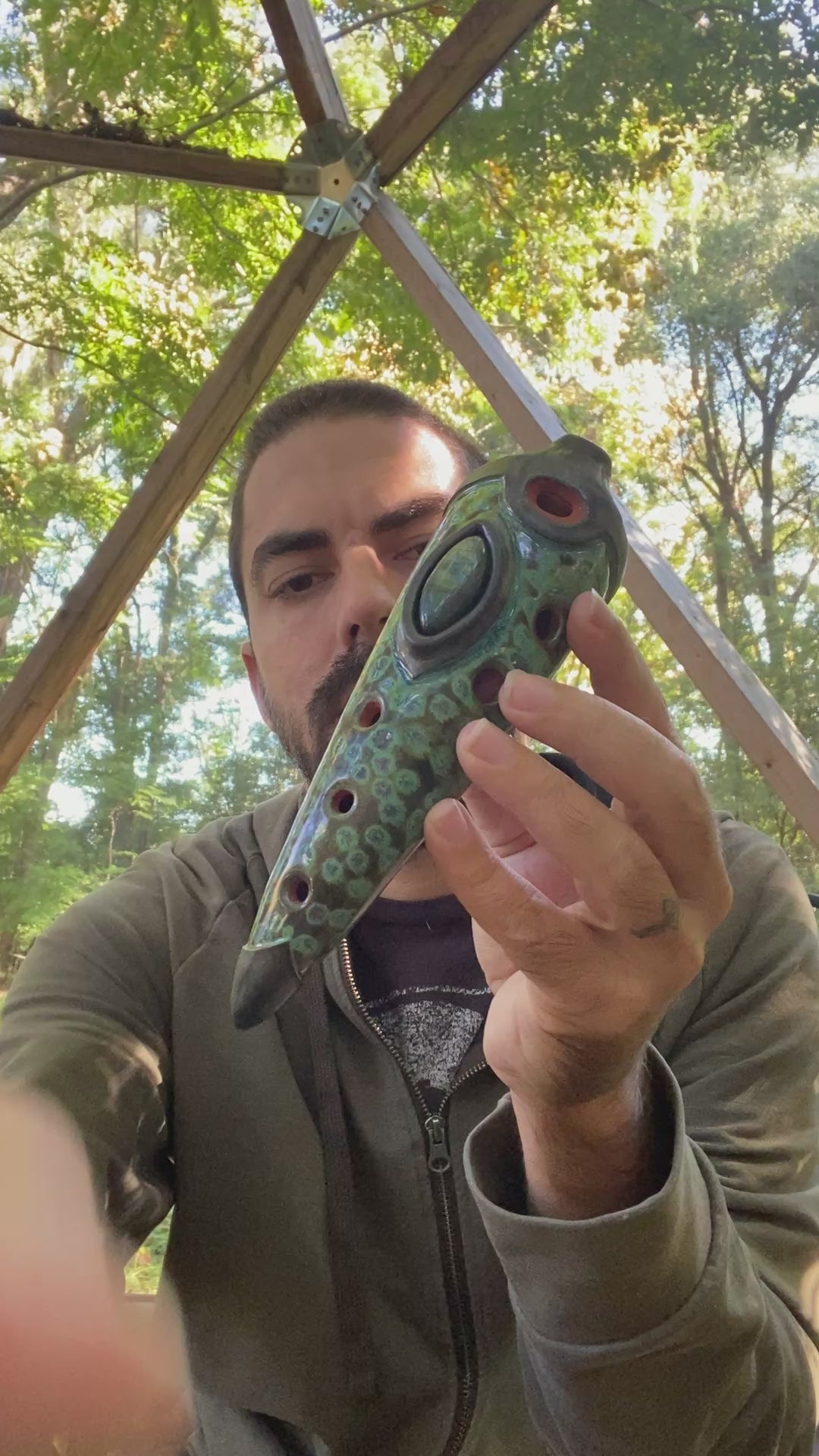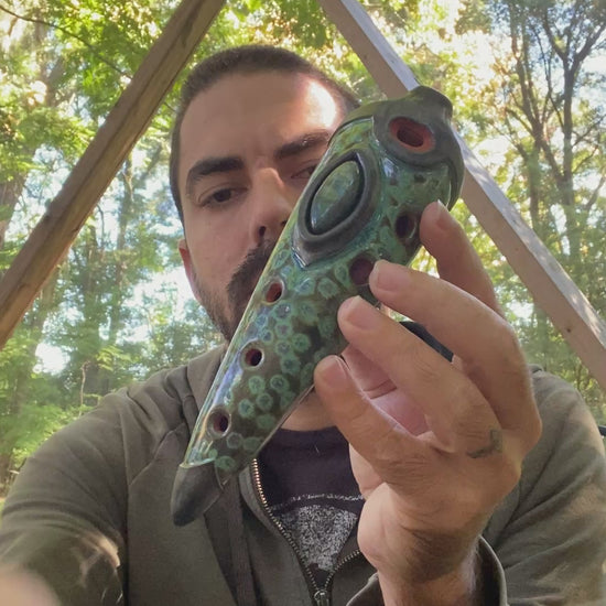 Handmade ceramic gemshorn tuned to the pentatonic minor scale in the key of Ab (432Hz). Features a stunning labradorite inlay and can also play a full octave of the major scale. Captivate listeners with its unique scale and exquisite craftsmanship. Perfect for musicians and collectors.