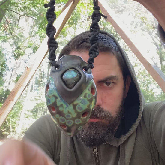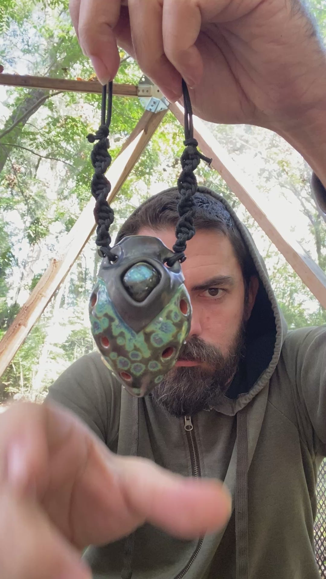 This Pentatonic Minor Pendant is handmade of red clay, featuring a stunning labradorite inlay and design. It is tuned to the Pentatonic Minor Scale in the key of E, making it a beautiful and unique piece of ocarina jewelry. Embrace your inner musician with this one-of-a-kind necklace.
