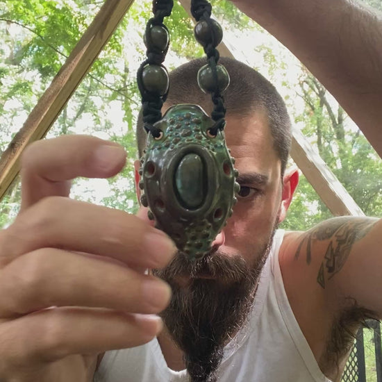 Crafted by hand with intricate detail, the Pentatonic Pendant is a clay ocarina with a stunning labradorite inlay. Tuned to the Pentatonic Minor Scale in the key of G#, this exquisite musical instrument offers a unique and soothing sound. Perfect for personal use or as a gift for music lovers.