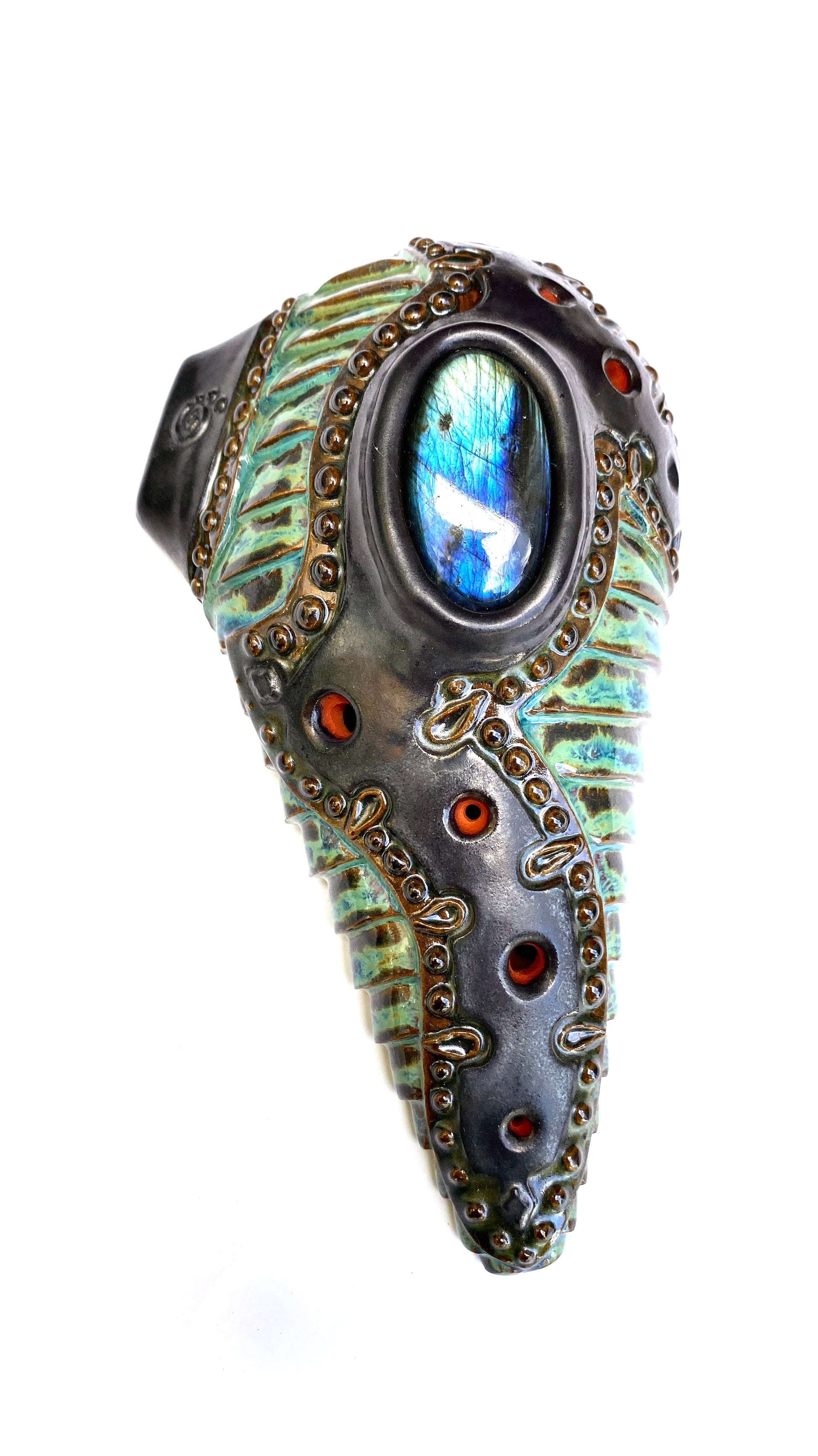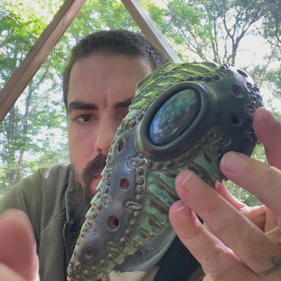 The Phrygian Harmony is a handmade double chamber flute, precisely tuned to the Phrygian Dominant scale in G and D at 432Hz. Constructed from red clay and featuring a labradorite inlay, this instrument offers enhanced acoustic properties, allowing for rich, resonant sound quality that appeals to both musicians and collectors.