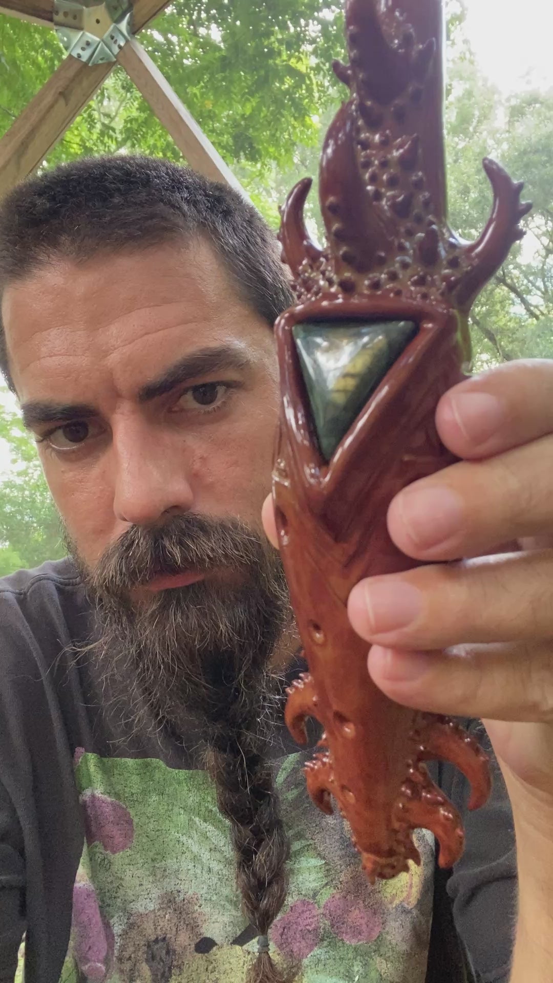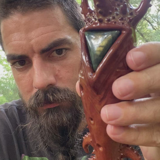 Expertly crafted from red earthenware clay, this one of a kind Sculptural Ocarina boasts a unique shape and stunning labradorite stone inlay. Tuned to the Phrygian Dominant scale in the key of Bb, it offers a rich, ethereal sound perfect for any musician or collector.