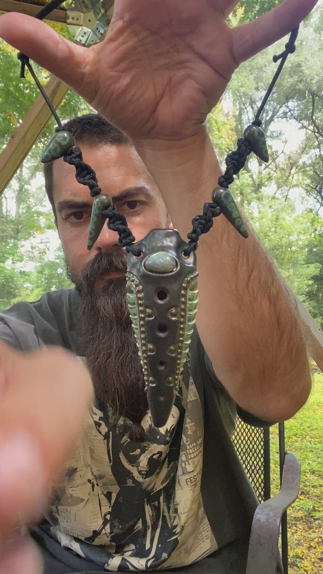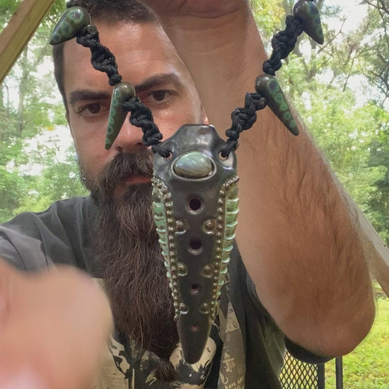 Expertly crafted, the Spike Pendant Ocarina is a must-have for any musician. Its handmade design and English cross fingering tuning allow for a wide range of scales, while the stunning labradorite inlay adds a touch of elegance. Play with precision and style with this chromatic ocarina in the key of Eb.