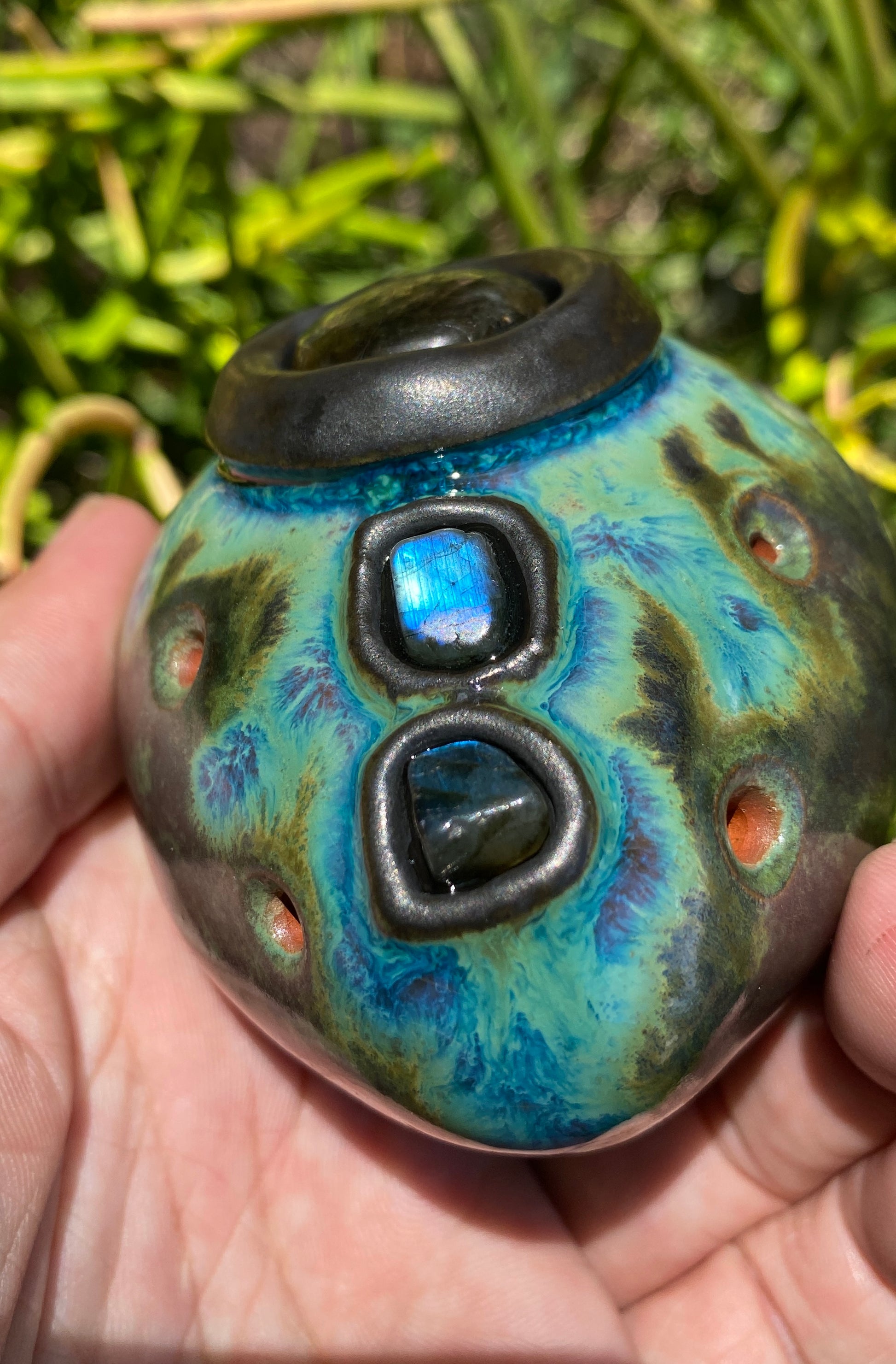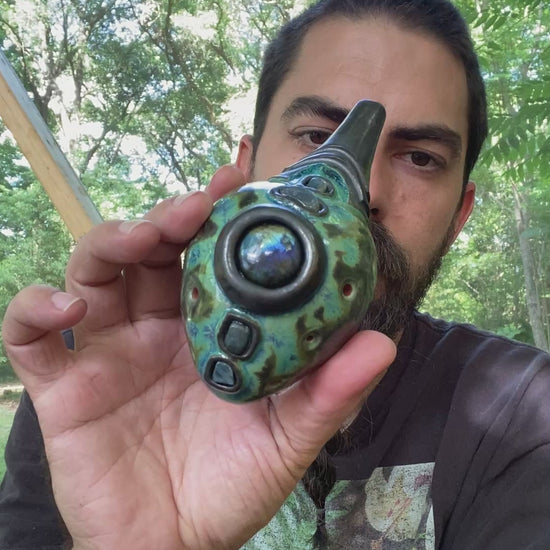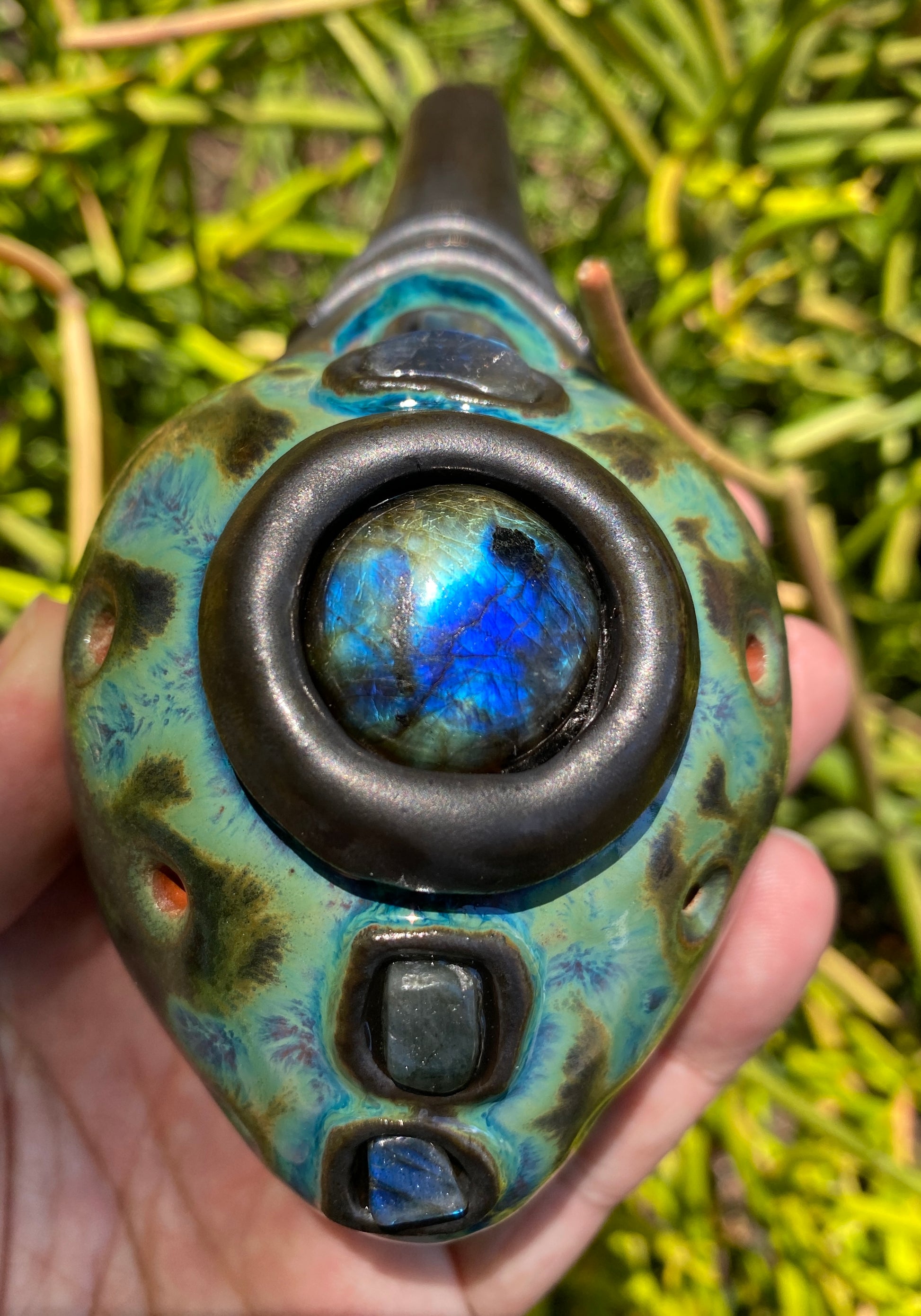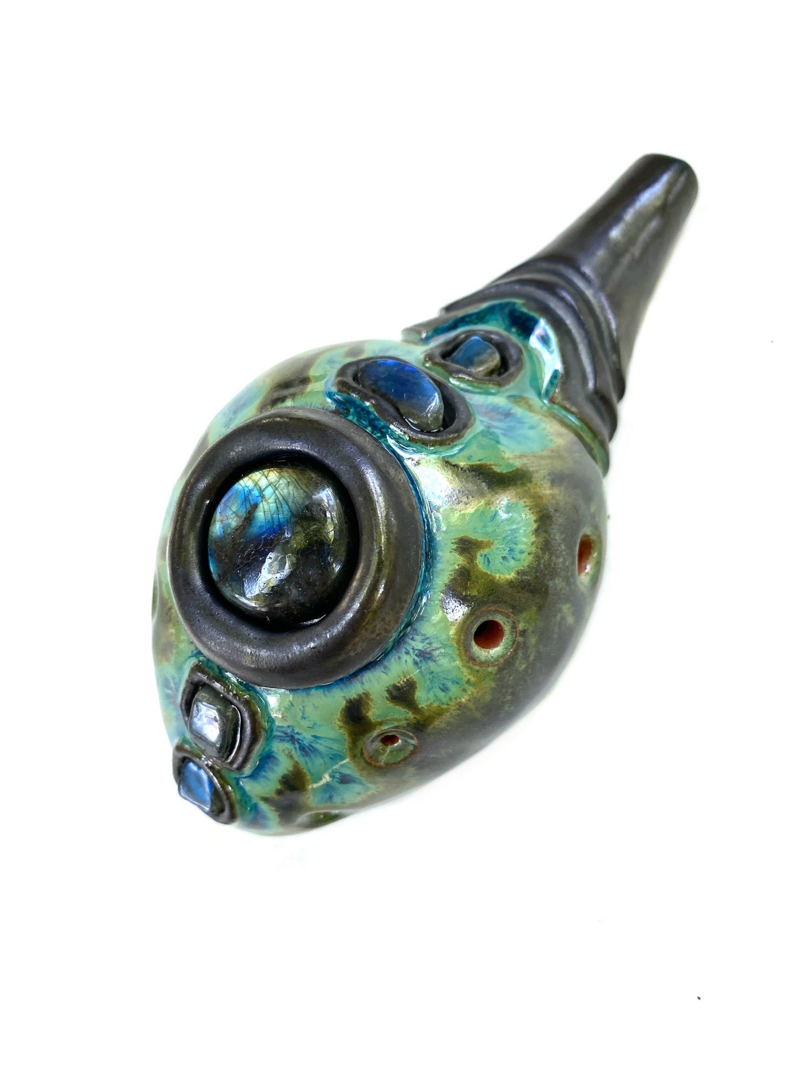 This handmade clay double flute is tuned to pentatonic minor in the key of Db (432Hz) and features five beautiful labradorite inlays. Expertly crafted and uniquely designed, this two-sided drone vessel offers a harmonious and resonant sound, perfect for musicians and flute enthusiasts alike.
