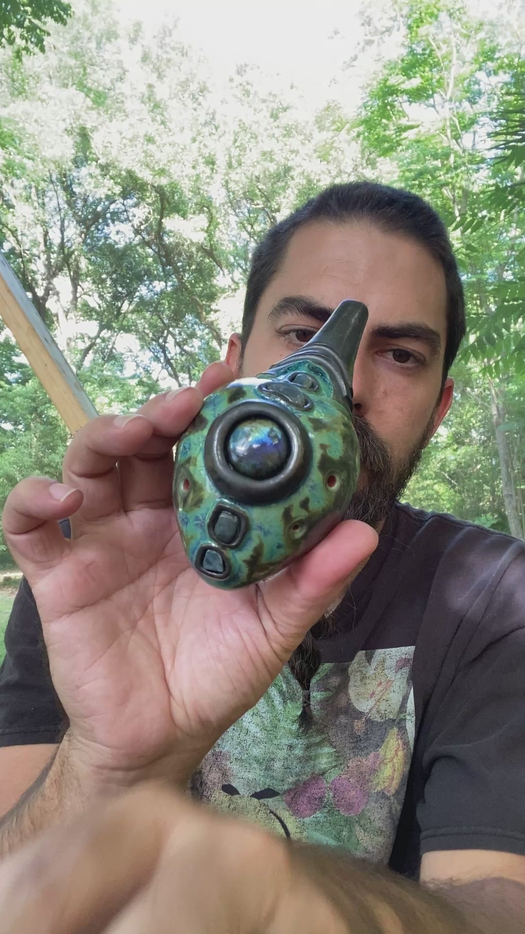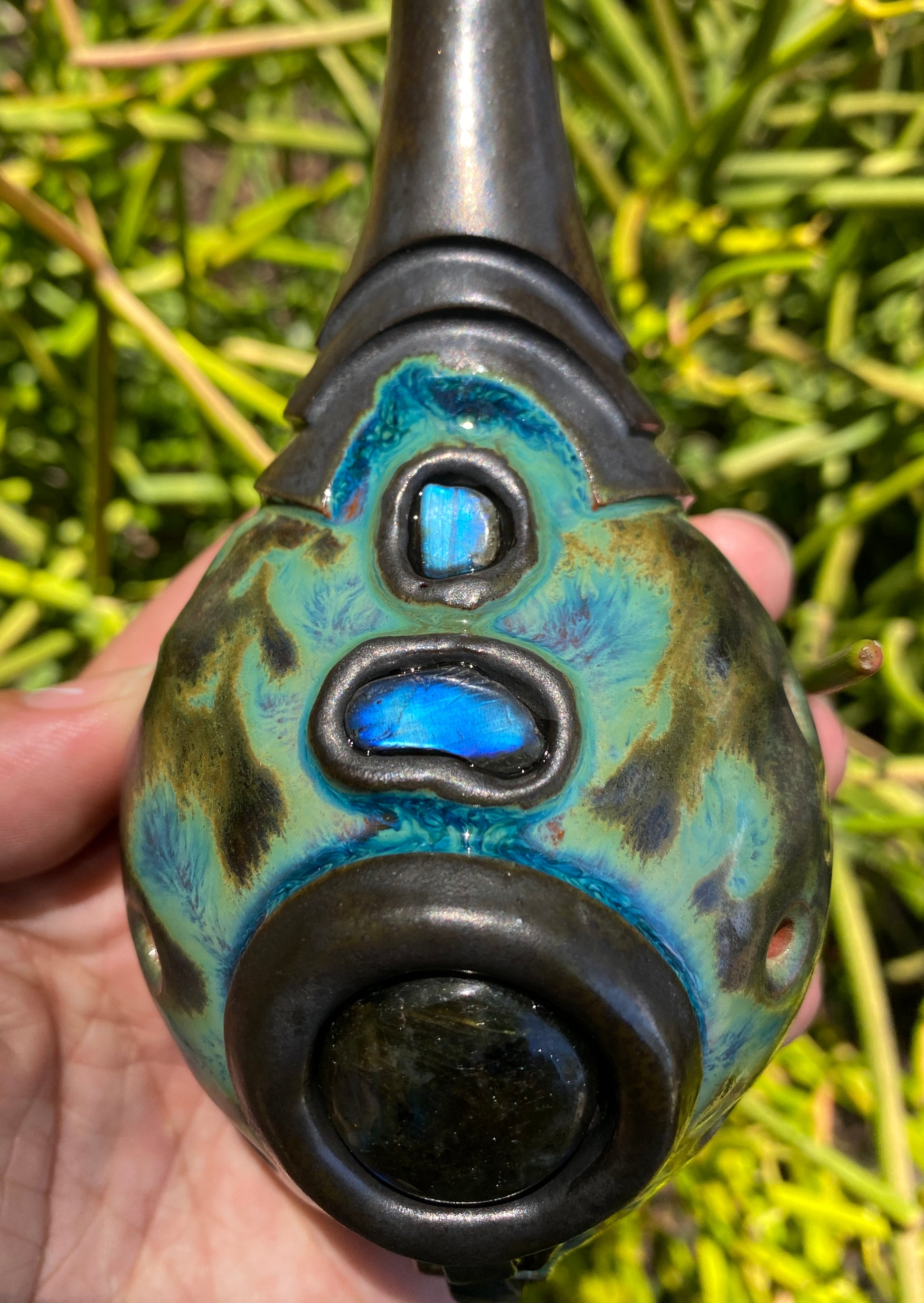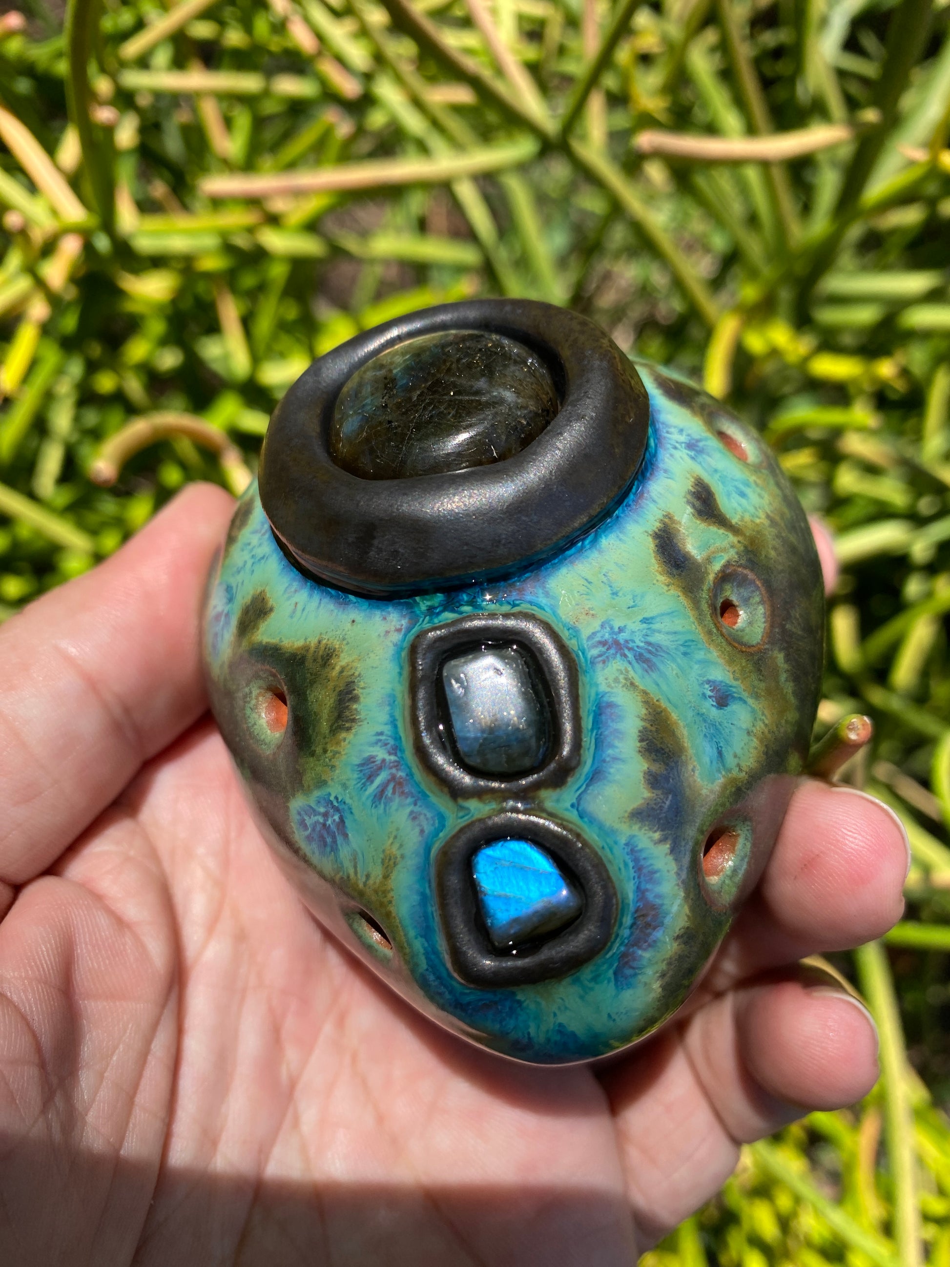 This handmade clay double flute is tuned to pentatonic minor in the key of Db (432Hz) and features five beautiful labradorite inlays. Expertly crafted and uniquely designed, this two-sided drone vessel offers a harmonious and resonant sound, perfect for musicians and flute enthusiasts alike.