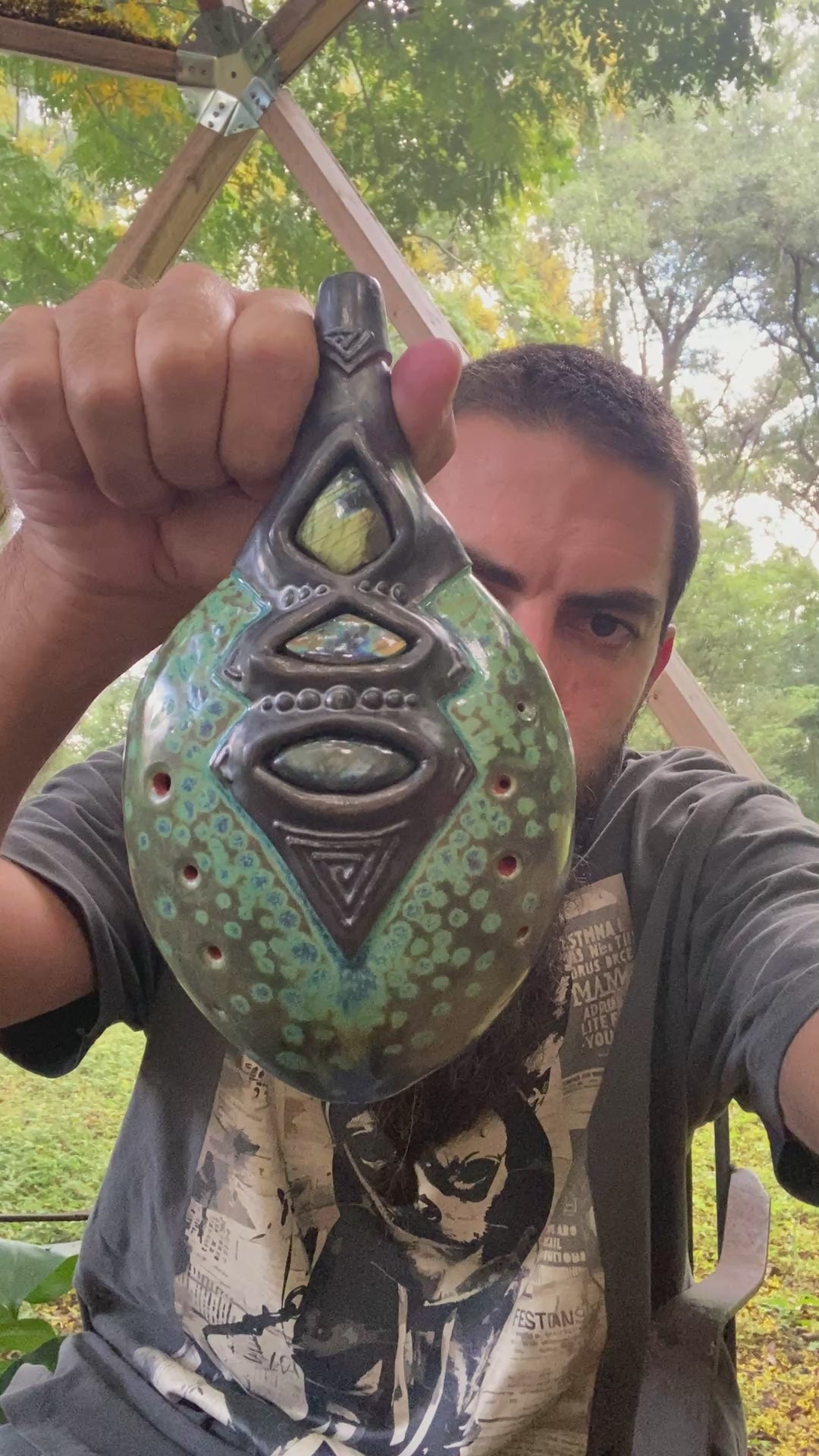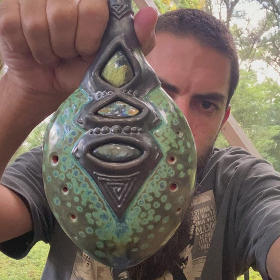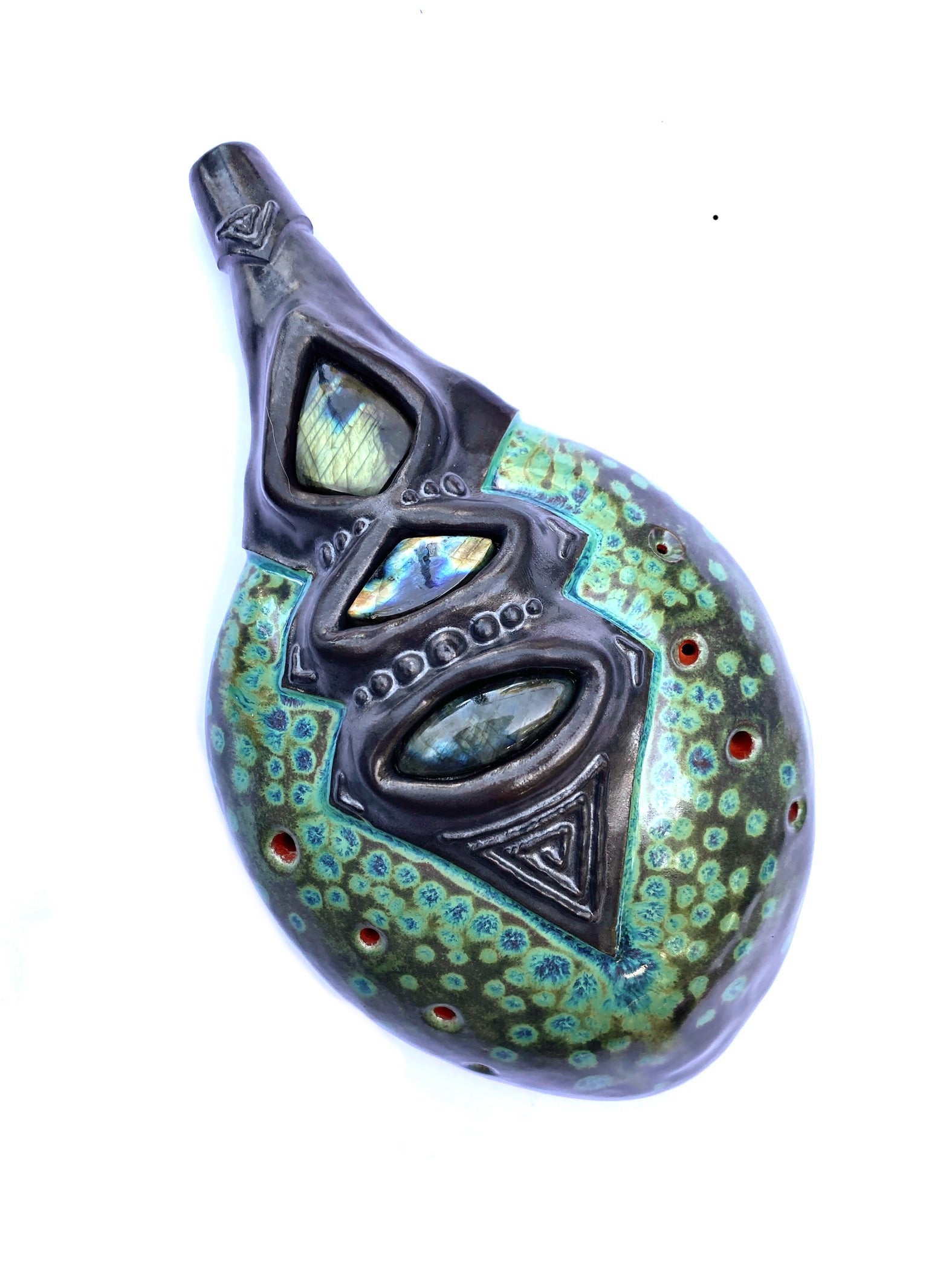 Introducing Triple Chamber Harmony, a handmade 3 chamber ocarina that produces a unique and soothing sound. With its precise tuning in Eb, Eb, Ab (432Hz) in Major, and 3 beautiful labradorite stone inlays, this ocarina is not only a musical instrument but also a work of art. Enjoy intricate carving and perfectly harmonized melodies.