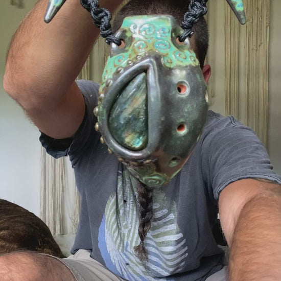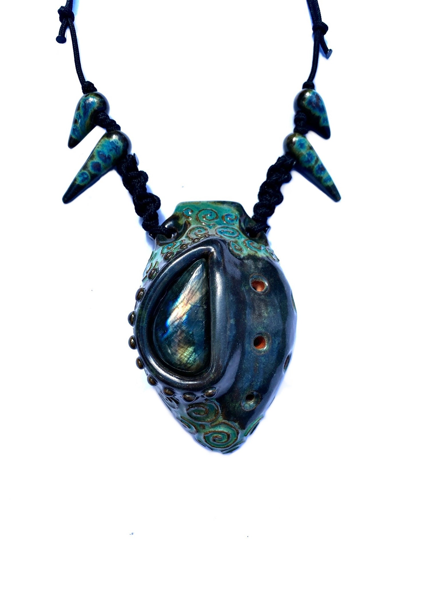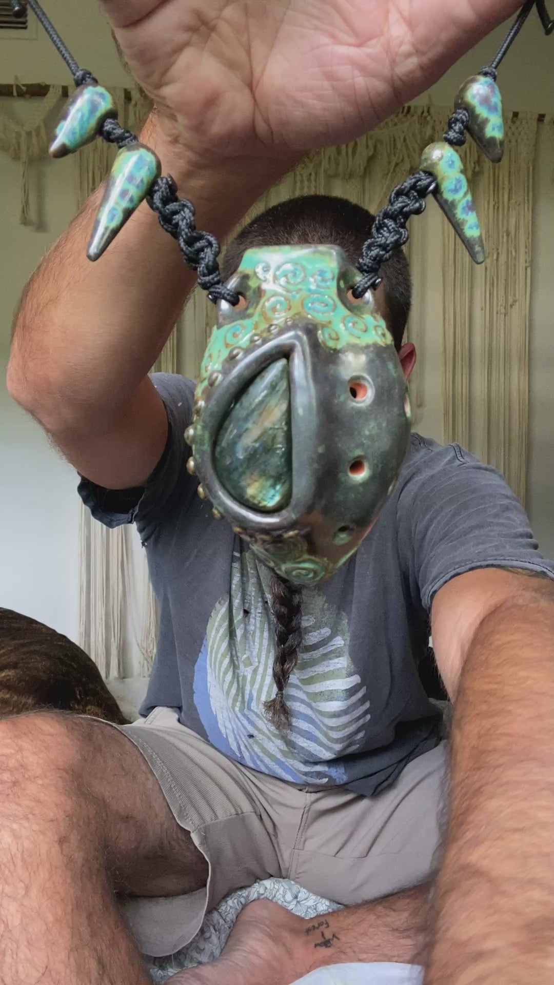 Presenting the Pentatonic Drone Pendant - a meticulously handcrafted, double chamber ocarina made from red earthenware. Adorned with a stunning labradorite inlay and decorative spiral designs, this musical instrument is tuned to pentatonic minor in the key of Gb. A must-have for music enthusiasts and collectors alike.